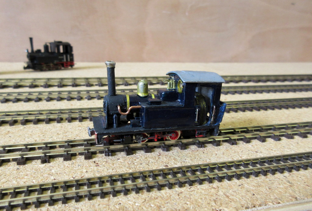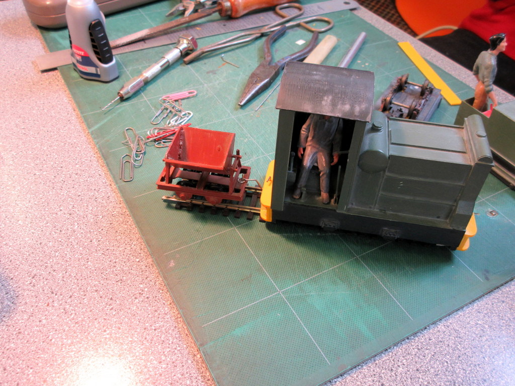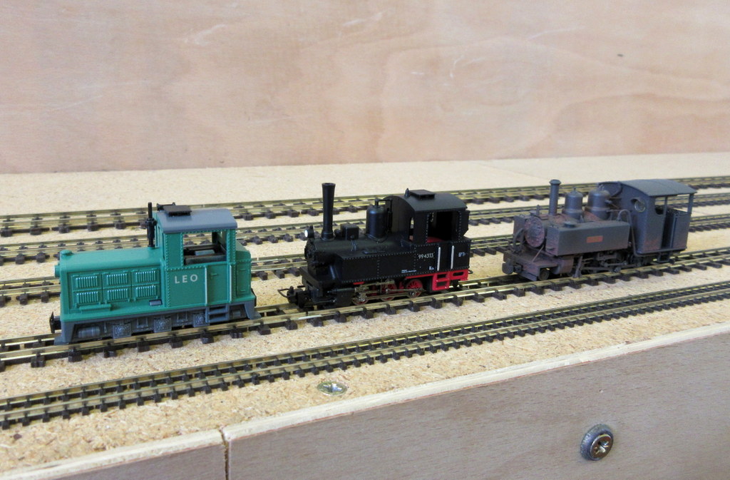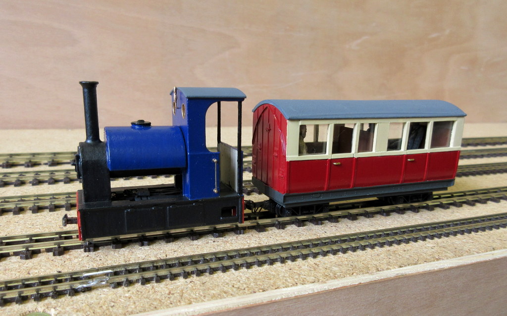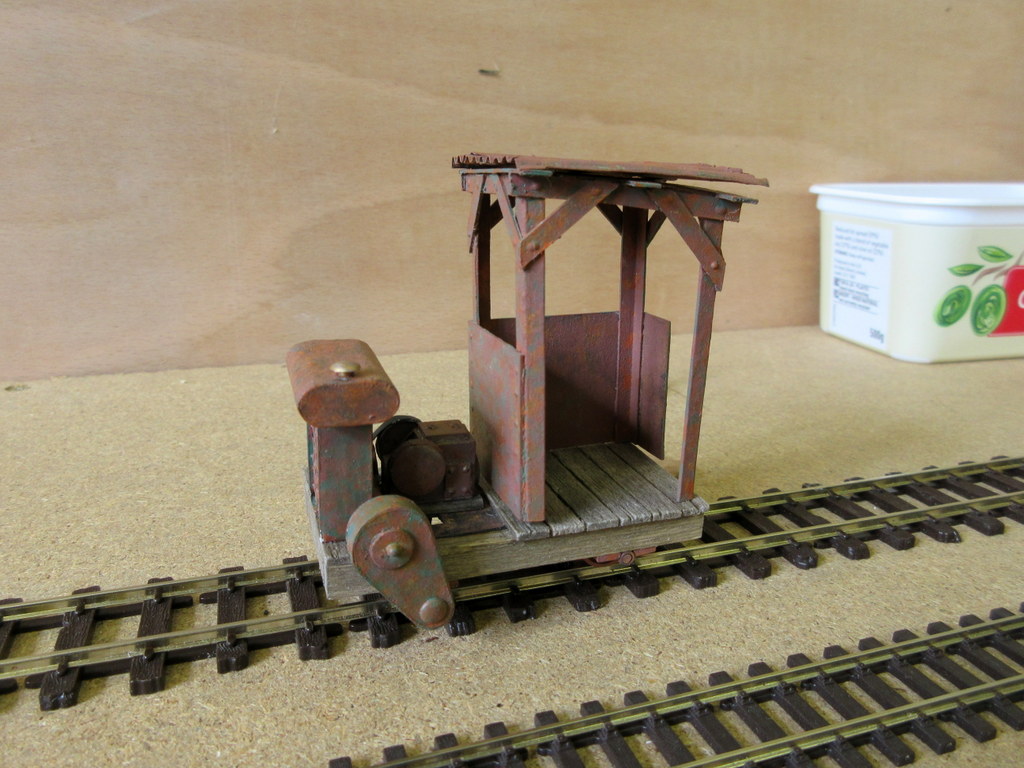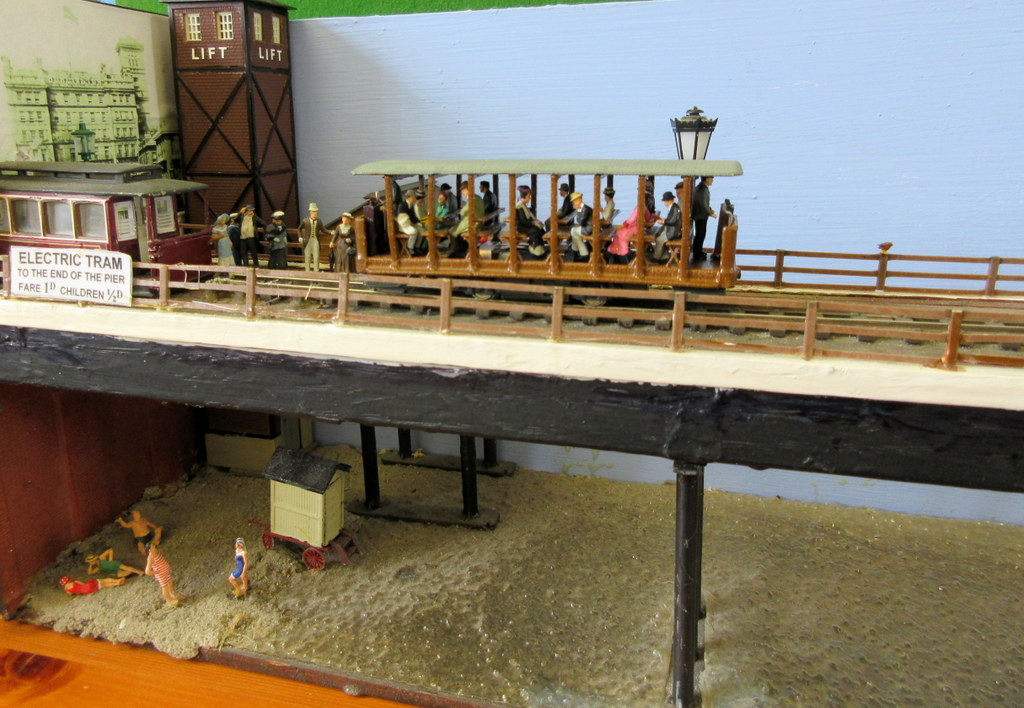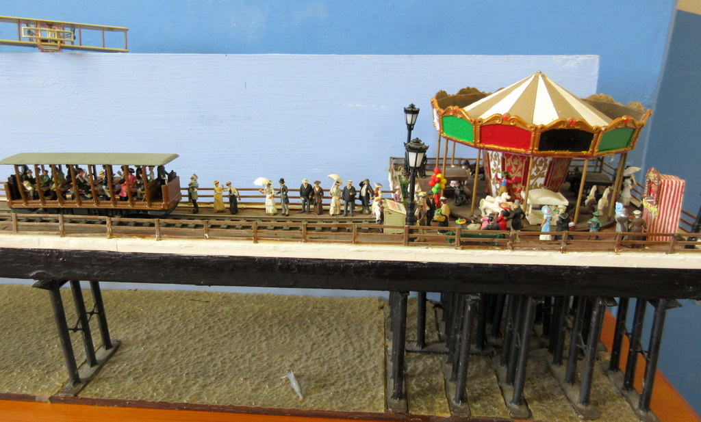 Stewart Green’s lovely seafront scene provisionally named “Beside the seaside”. This will be one of a series of “framed” scenes for a wall display.Another seaside scene and a familiar model by Dave Carson. His Victorian “New Walmington Pier” has been exhibited many times around East Anglia and has lots of character. This is the landward end of the pier with the beach and lift. The tram is a Southend pier car Shapeways 3D print running on a Kato chassis.Graham Wilson brought along this 0-16.5 Irish bogie guards van, a kit by an unknown maker.Another 0-16.5 Guards van was this GVT Smallbrook model obtained by Ray. He has repaired and painted it.A new Shapeways saddle tank loco and prototype coach in 09 scale built by Graham Watling.A PECO 009 “Jeanette” kit running on an Arnold chassis which was repaired by Jim, and now runs very well.Another quirky scratch built model built by Bill in 1:16 for his Group challenge diorama, based on a Brian Clarke drawing. Three familiar Hoe/009 locomotives that were “for sale” by Ray, the Roco (33209) six-wheeled diesel, Roco (33241) Tank loco, and Bachmann Baldwin “Hummy” in weatherd black. TThe SM32 scene built in mdf by Stuart Hughes for our first group “challenge” in 2015, now owned by Alan.