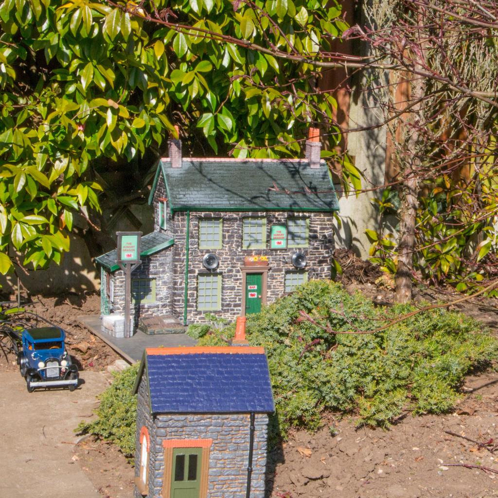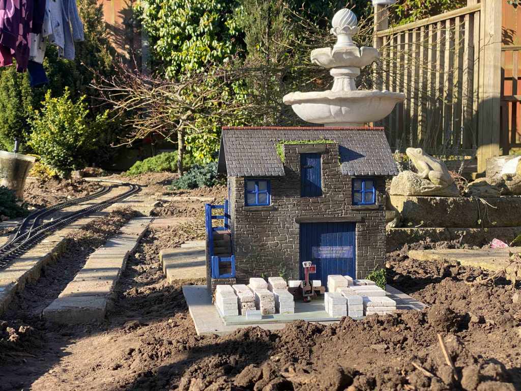 Two garden railway buildings from Andy’s “Crowfoot Light Railway”. The stone mason’s building is a 16mm/ft resin kit constructed in a freelance manner. The pub is called The Hungry Dragon and is a 16mm/ft resin kit. The small building in the foreground is a crossing keeper’s cottage so it can be seen that the pub is tucked away a bit. The railways buildings are normally stowed away with others when not in use.