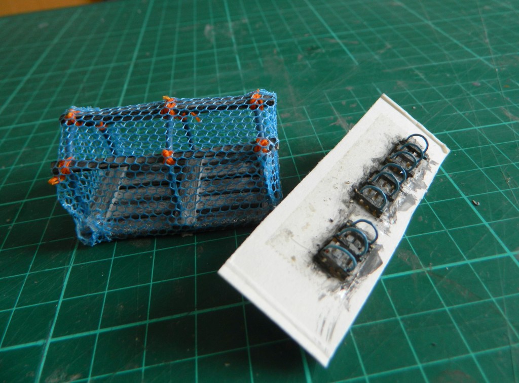 Alan has been busy planking his 16mm Aldeburgh beach boat. It needs 32 planks in total, and each plank takes about an hour to measure cut out and fix. He has also been making a few lobster pots in 4mm scale for Stewart Green and are photographed here with a 16mm version to show the size difference.
