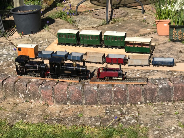 Stewart is working on the final module for Wonder Wall – Alpentor, N scale, with a mountain stream running through a wooded valley. N scale was chosen due to the logistics of motive power on such tight curves, but can still pass for a large narrow gauge railway. The wall has been papered and just awaits the arrival of the last section. This is a photo of the SM32 locos and stock recently donated to the Halesworth to Southwold Narrow Gauge Railway Society.Now to some big stuff: Stuart has started building a 3 1/2″ quarry Hunslet. Frames, wheels, bearings and buffers complete so far.