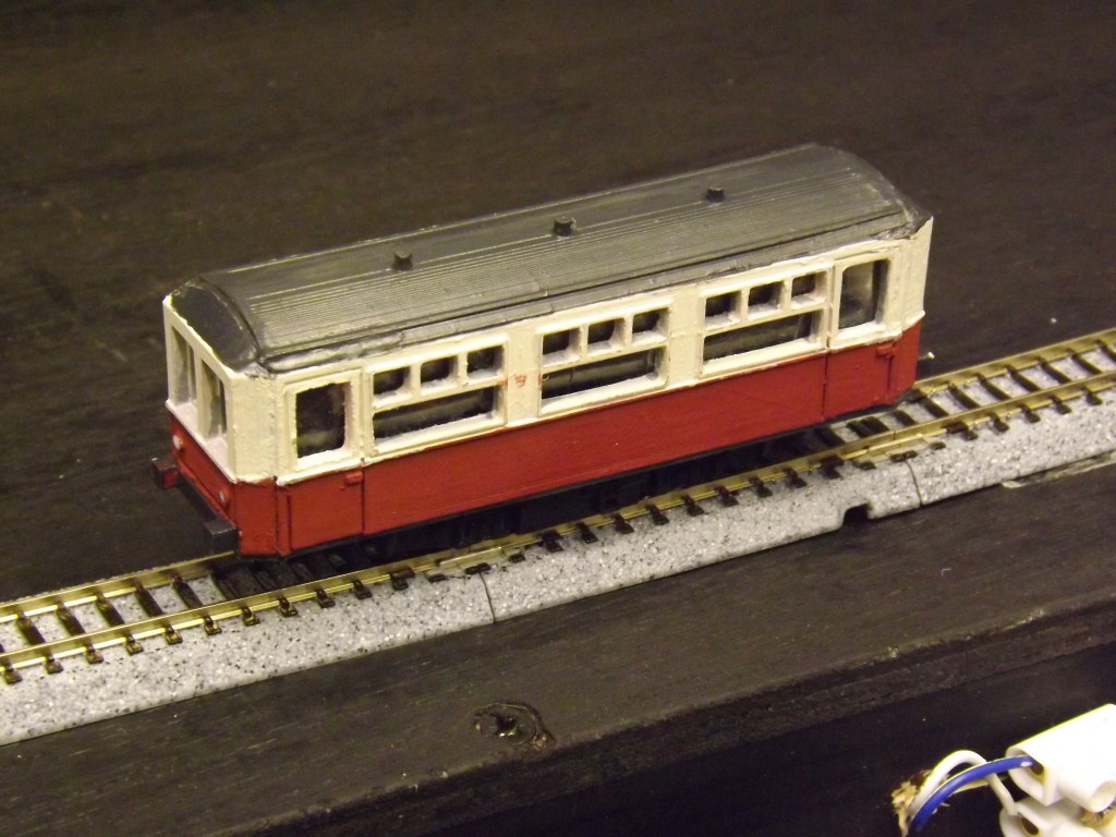 Left: A recently acquired 3D print of the miniature loco ‘Effie’ and her associated donor chassis for Ian’s “Hubbard’s Hills” layout. And Right: Budget Model Railways Railbus by Jeremy, mounted on a Kato chassis and well weighted, it is classed as 009, but intended to run on an HOe layout.