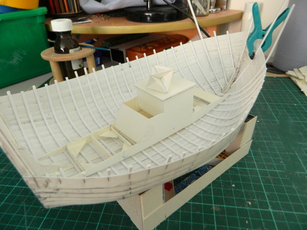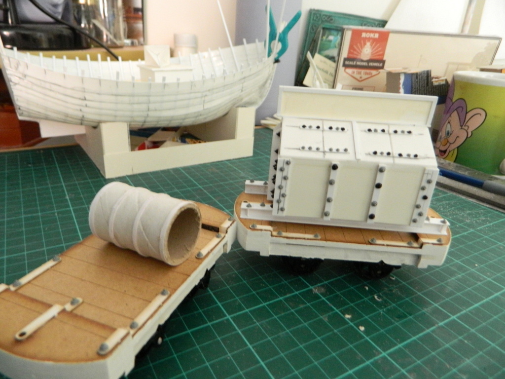 Alan provided photos of his SM32 Aldeburgh Beach boat with planking now complete. Timbering (ribs) are also almost complete and a card stand has been built to help with construction and for it to travel on when going to exhibitions. A card template of the interior fit out was then made to get the proportions correct and this in now being reconstructed in plasticard. He has also been working on some wagon loads for the layout, in the second photo is the insulated ice delivery box with advertisement sign, made of plasticard and it has many Cambrian bolt head highlights. Just started, is a 45 gallon bowser wagon to carry fuel for the boats.