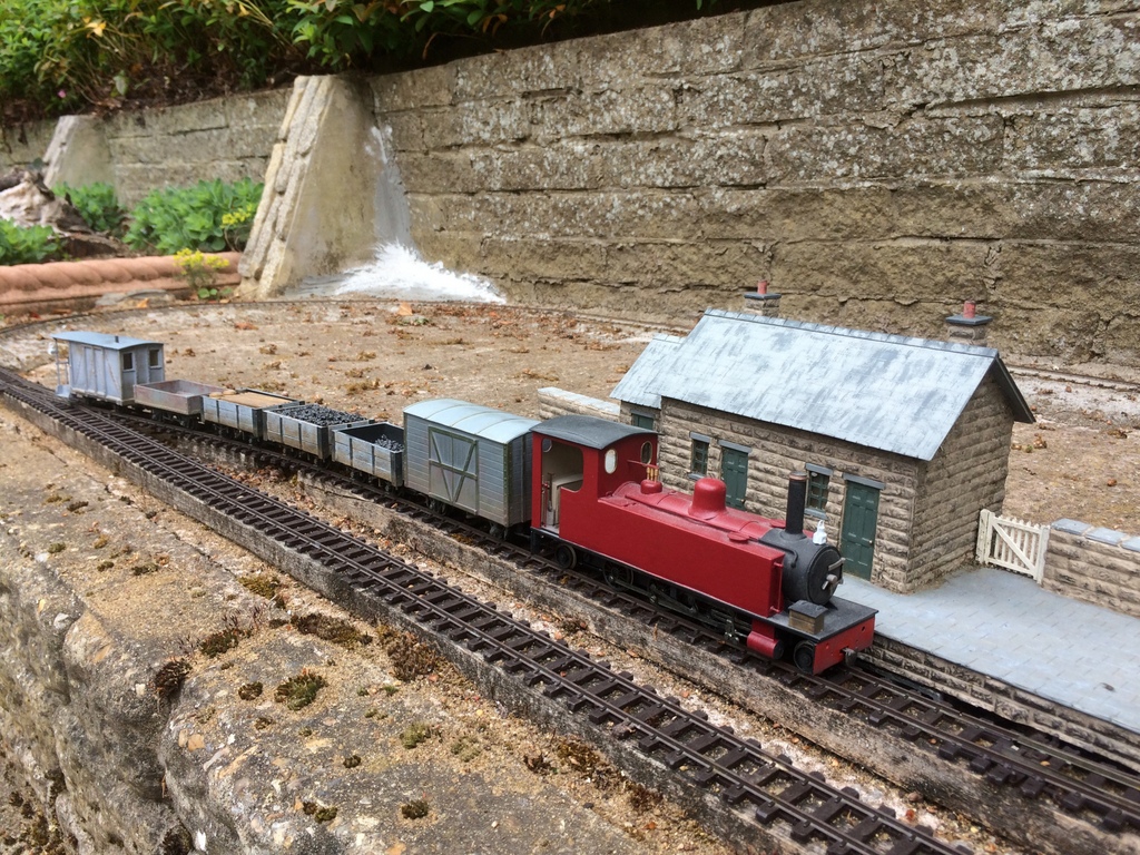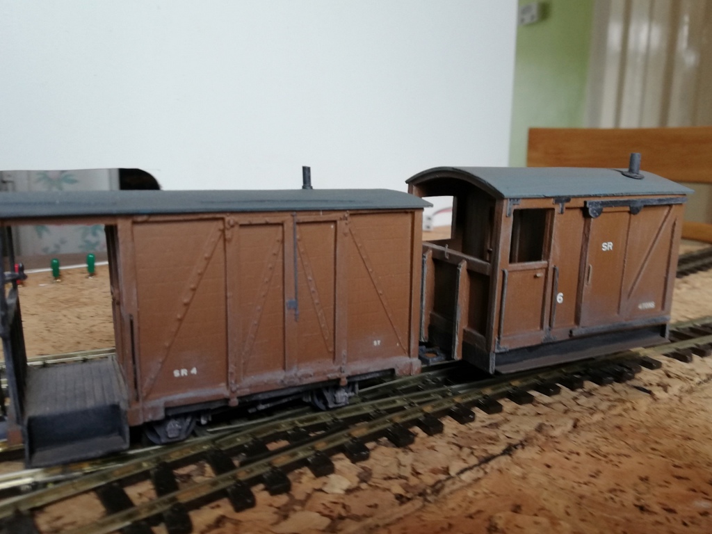 Rays 0-16.5 second hand brass Kerr Stuart bought recently, given a new Hornby chassis, some detailing, and a repaint, now named “Hope”. Also two brake vans, one a kit from James Corsi in ply with outer frame-work added on an Airfix chassis. The other is a Smallbrook Studio resin freelance kit model. The photos were taken on a small shunting layout, in the course of construction, which is 3’3″ long with a second baseboard 2’9″.