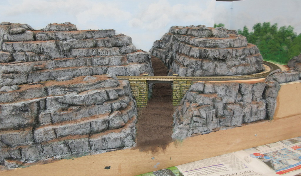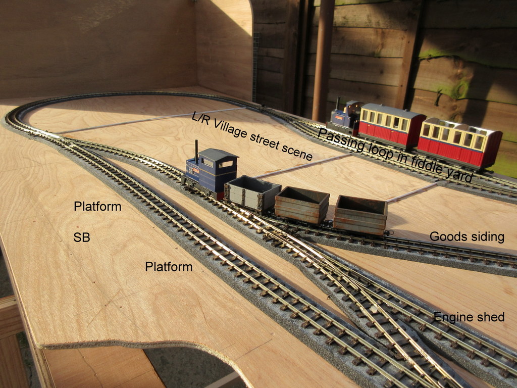 A photo of Graham’s 09 scale layout being test run now that the track is laid. This is the station/village board showing approximate positions of the proposed features. On the other board is a rocky area with a bridge crossing a stream. The rock faces have just been finished and are made of a lightweight filler, sawdust, p.v.a, acrylic paint and water mixture on a polystyrene base and coloured with acrylics.
