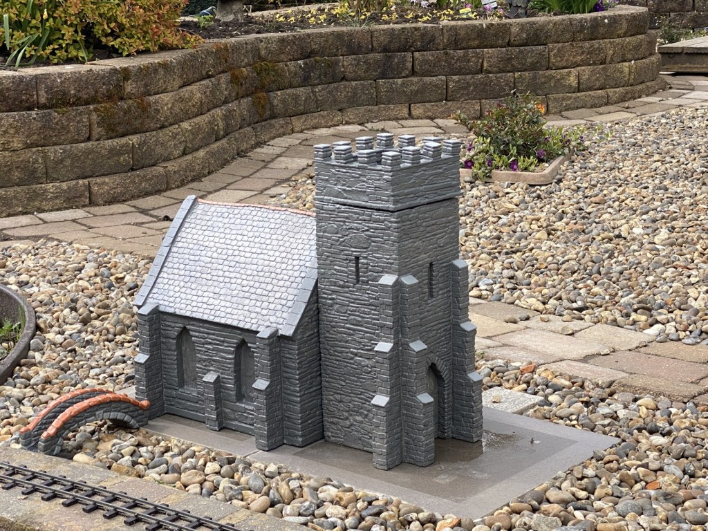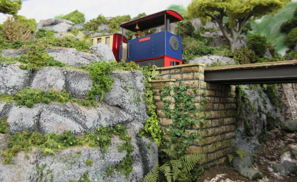 Martin E is freelancing an Emmett loco at present in Gn15 scale. It runs on a battery powered Trackmaster chassis. A photo from Dave C of “New Walmington Pier”, 009 scale, with Southend Pier Toastrack cars 1 & 2 car 1, in Volk’s Railway teak livery and “Leader Car” No.2 in Southend Pier dark green. This is a partially completed cast concrete kit for Andy Mc’s 16mm/ft “Crowfoot Light Railway” and stands 18″ from the ground level to the top of the castellations.