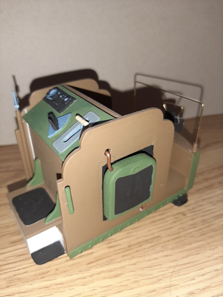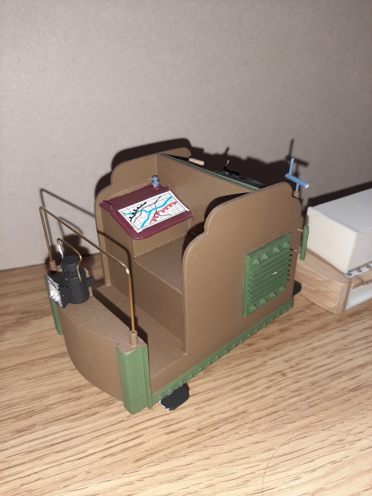 This SM32 model by Alan is a fictitious model of a WW1 General’s personal transport train, built after seeing a few pictures of a similar loco at a show. Features ink pot, map and a working front light.