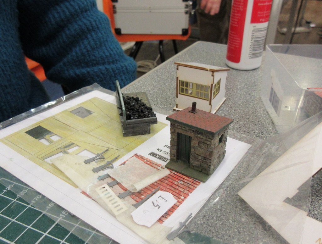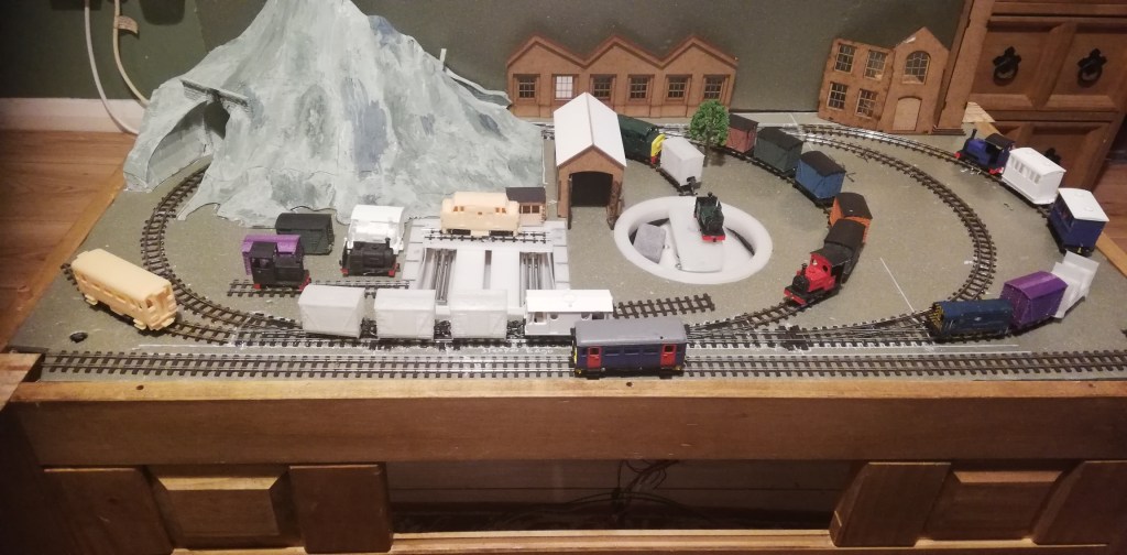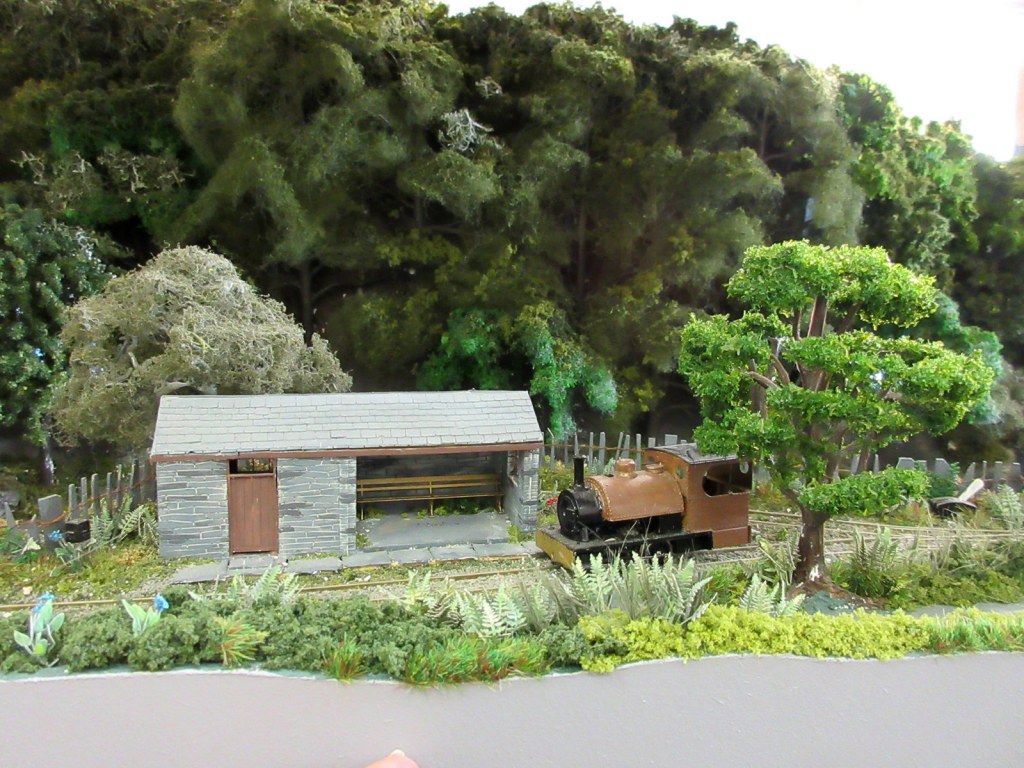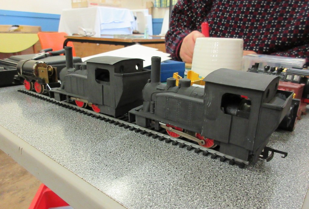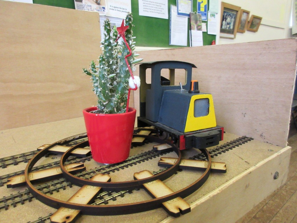 Christmas madness from Stuart.“Wonderwall” by Stewart: a series of animated miniature scenes. Entitled: Tovil Treacle Blenders, Beside the Seaside, The Windmill, Gandy Gorge, The Night before Christmas and Alpentor.Two Bachmann 009 “Livingstone Thompson” (391-103) Ffestiniog Double-Fairlies appeared, this one from Barry.Nigel was modifying a “00” loco body to run on a vintage Playcraft/Jouef chassis which run very well. These O-16.5 locos are two that he made a few years ago on the same type of chassis and it is hoped will run on an industrial layout in future. Richard was working on 009 models, building some Colin Ashby/009 Society open wagons and putting a razor saw to a 3D printed tram loco to make it a more suitable height.Graham brought along his table-top “Pye Rigg Works” O9 scale layout to test again, and along with it a new tram loco built using a Dapol Pug tank/boiler and footplate as a basis.Stuart displayed his Corris style 009 layout “Clliffordd Corris” and has started 16mm, 5″ gauge ride-on layout with elevated sections which will use 009 locomotives.Alan was continuing to scratch build both 12mm and 16mm scale “Tin Turtle” armoured Simplex’s.Ray was displaying two of his O-16.5 Smallbrook Studio’s models, an “Echo ET” and an “Anax”, and also working on a 009 Lynton Frame Cabin.This mash-up of wires and circuits is a prototype circuit built by John for a 009 turntable which stops at tracks, isolates and changes polarity, all working quite well.David has made good progress with his 009/HOe layout in a coffee table which rises and falls within it’s frame. The main loop has been laid, and the track for the sidings has been curved to approximate shape ready for laying. It is temporarily wired up to test trains.