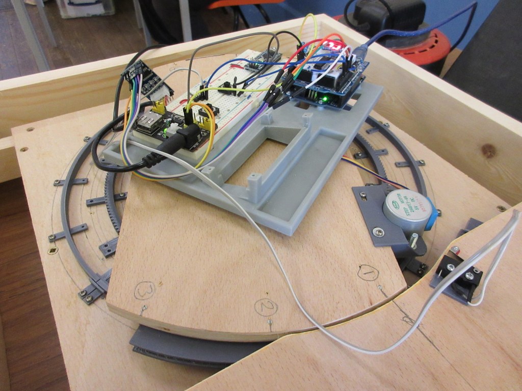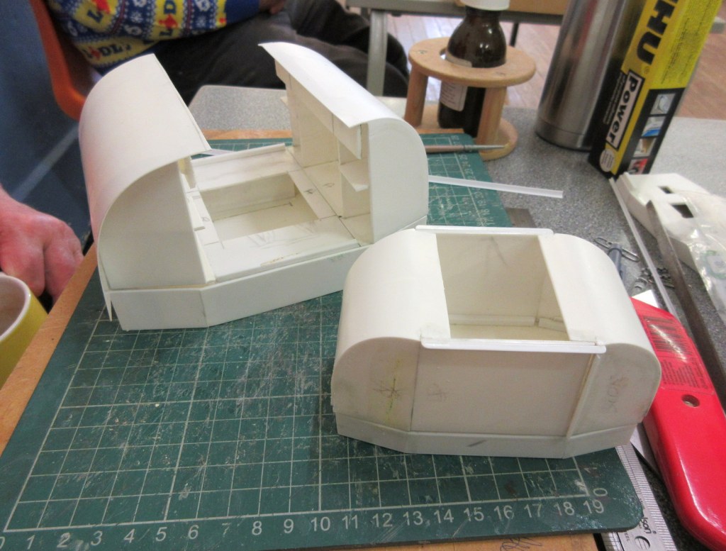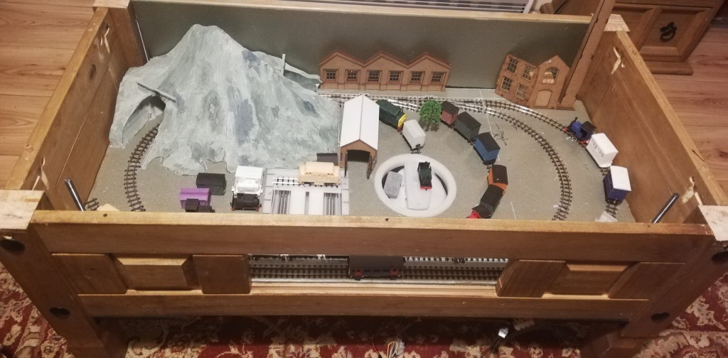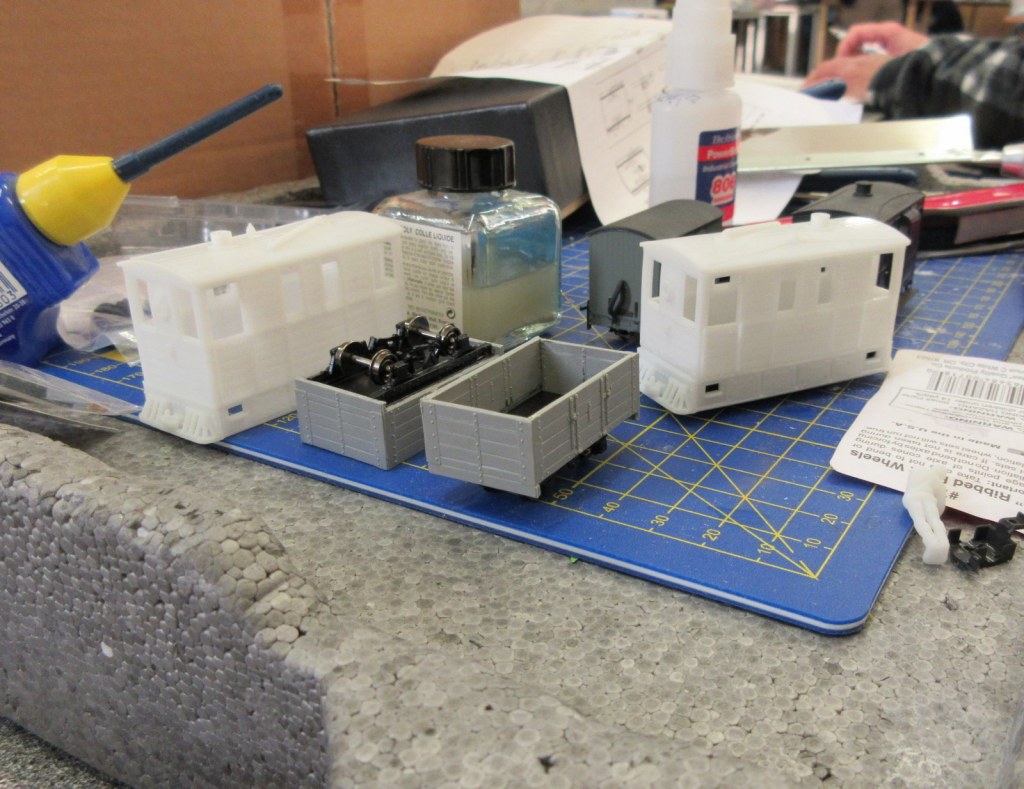 Christmas madness from Stuart.“Wonderwall” by Stewart: a series of animated miniature scenes. Entitled: Tovil Treacle Blenders, Beside the Seaside, The Windmill, Gandy Gorge, The Night before Christmas and Alpentor.Two Bachmann 009 “Livingstone Thompson” (391-103) Ffestiniog Double-Fairlies appeared, this one from Barry.Nigel was modifying a “00” loco body to run on a vintage Playcraft/Jouef chassis which run very well. These O-16.5 locos are two that he made a few years ago on the same type of chassis and it is hoped will run on an industrial layout in future. Richard was working on 009 models, building some Colin Ashby/009 Society open wagons and putting a razor saw to a 3D printed tram loco to make it a more suitable height.Graham brought along his table-top “Pye Rigg Works” O9 scale layout to test again, and along with it a new tram loco built using a Dapol Pug tank/boiler and footplate as a basis.Stuart displayed his Corris style 009 layout “Clliffordd Corris” and has started 16mm, 5″ gauge ride-on layout with elevated sections which will use 009 locomotives.Alan was continuing to scratch build both 12mm and 16mm scale “Tin Turtle” armoured Simplex’s.Ray was displaying two of his O-16.5 Smallbrook Studio’s models, an “Echo ET” and an “Anax”, and also working on a 009 Lynton Frame Cabin.This mash-up of wires and circuits is a prototype circuit built by John for a 009 turntable which stops at tracks, isolates and changes polarity, all working quite well.David has made good progress with his 009/HOe layout in a coffee table which rises and falls within it’s frame. The main loop has been laid, and the track for the sidings has been curved to approximate shape ready for laying. It is temporarily wired up to test trains.