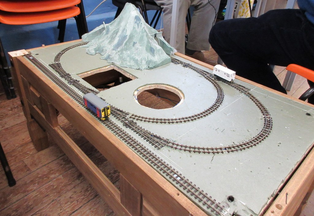 Above: Track is now being laid on Davids 009/HOe coffee table layout that lowers into the tables frame.