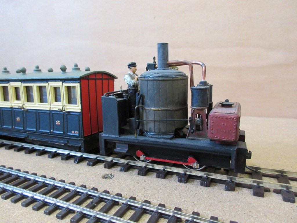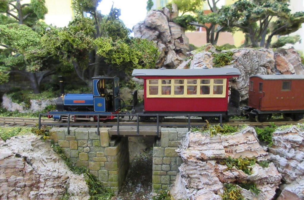 Barry’s recent acquisitions, a lovely O-16.5 Smallbrook Studio “Etna” vertical boiler loco with a “locos n stuff” chassis, and bogie coach of unknown make, plus some Ravenglass and Eskdale style coaches pictured with an older diesel kit. Graham also brought along his current HO9 layout “Sampson Vale” to test – a re-build of a competition layout he built 20 years ago. He commandeered Stuart’s “Britomart” loco to run on the layout.
