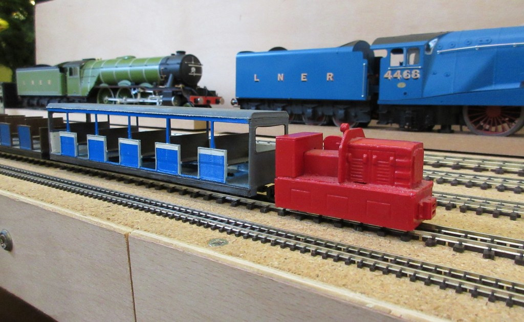 Graham displayed three 3D printed O9 scale models which he has made in the last month, a freelance tram loco, box van and guards van, – prints by floyd_kraemer (via Ebay).