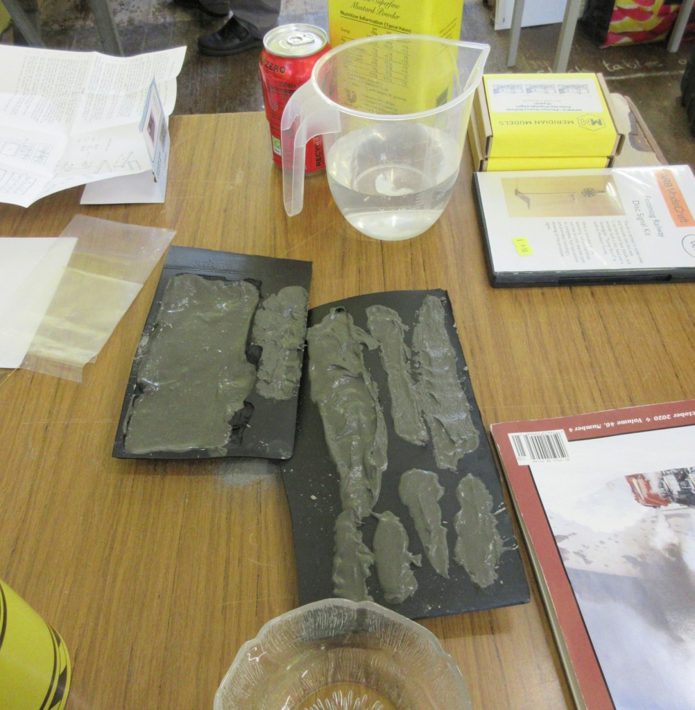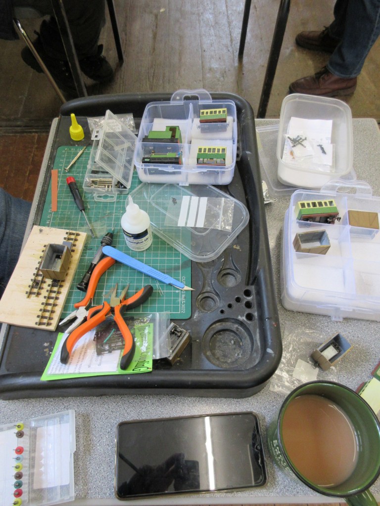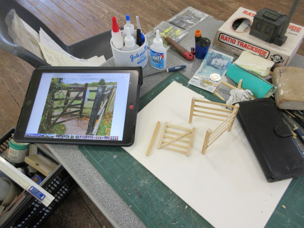 Chris made this O scale Lamp Hut for one of his current projects.Malcolm was making this kissing gate for his 16mm Challenge project.John made-up many Greenwich 009 couplings.Stuart was making rocks in moulds using coloured grout material.Neville was making up a Cattle Pens kit (by Campbell Scale Models) for his HOn3 US layout.Ray was assembling a OO Metcalfe Parish Church kit for a friend.Bill was scratch building a O scale Dairy Depot also for a friend.Mike was building a Dundas Freelance 4-wheel coach.