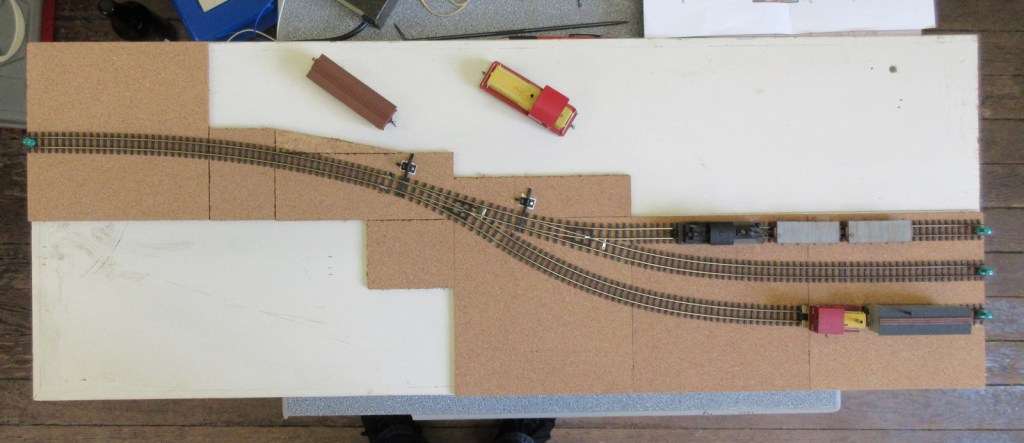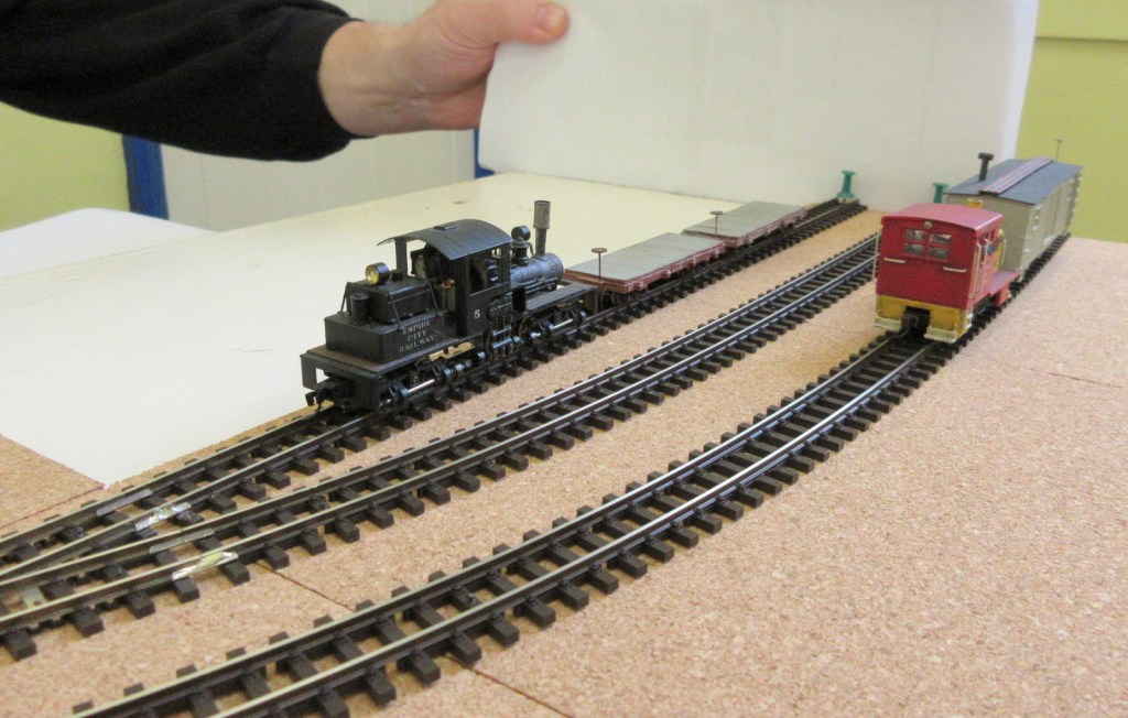 Above: Geoff was adding and adjusting parts to his clever “box” baseboard system for his O-16.5 Challenge layout which will be contained in a totally enclosed box for storage and transport.