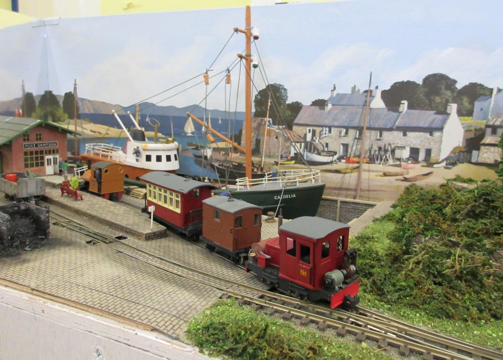 New Bachmann 009 locos displayed by Stuart: Pen-yr-orsedd Quarry Hunslet “Britomart” and “mainline” Penrhyn Quarry Hunslet “Blanche”. Blanche is photographed with three Penryn Quarry Fullersite dropside wagons made by Stuart on the day. Richard was testing a new HOn30 micro layout board with a Shay and a diesel from his “Empire City Railway” stock.