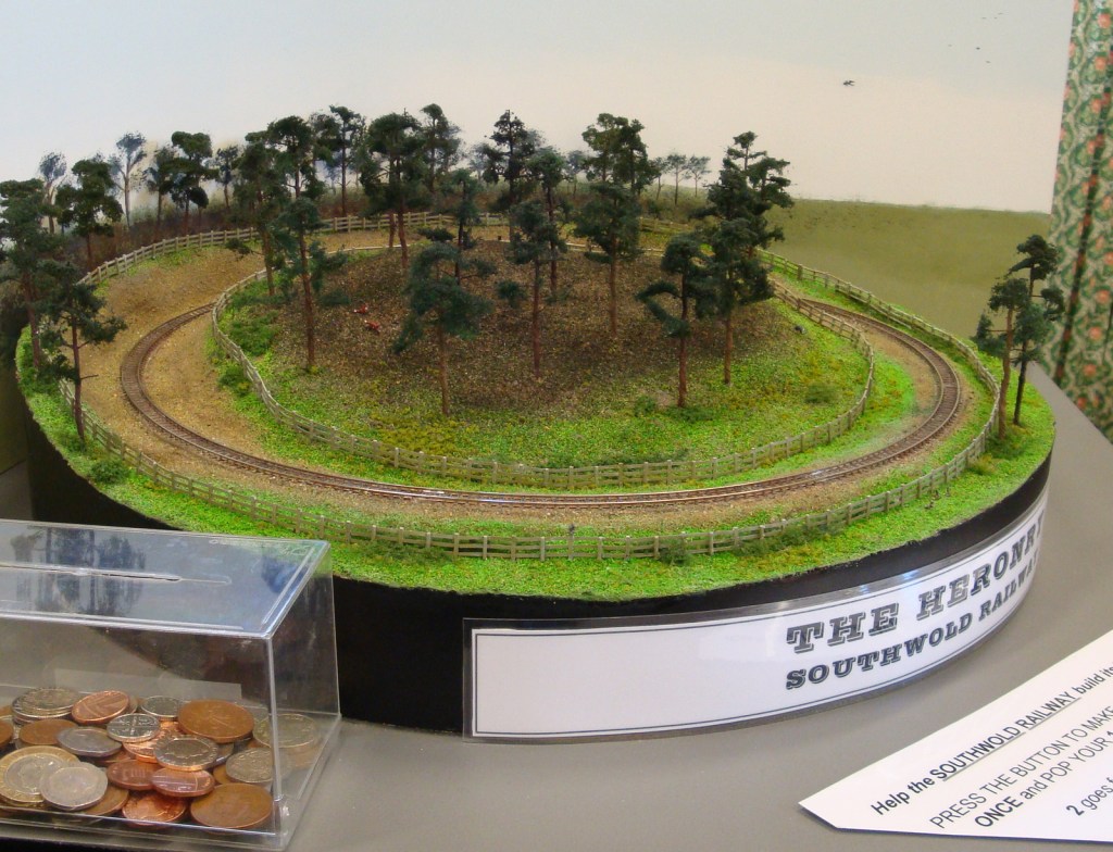 Quite a lot happened that first year. Richard built a multi-gauge test track so that we could try out and display our models at Group meetings. After a few months we looked at the feasibility of putting on an exhibition the following March to mark our first anniversary as we realised we had enough layouts amongst us to fill a small hall. Richard looked into hiring (what was then) the St John’s Ambulance Hall in Blyburgate, Beccles, which has remained our annual exhibition venue, now called Blyburgate Hall. Someone also had the bright idea of suggesting we do a Group Challenge, and this involved some of us building a small layout “Two Foot Square” or 288 sq. inches also that year. We would give the visitors (if they came along!) a slip to vote for their favourite layout. A Trophy was arranged for the winner, and it was hard to believe (that with such a small group, and many of us operating layouts that day) it was a success.