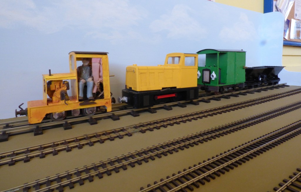 A selection of Nigel’s 16mm locos and skips on the test track.