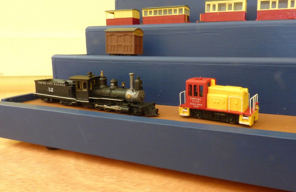 Two of Richard’s USA Empire City Railway locomotives for HOn30, a Toma Model Works Sandy River 2-6-0 and a Chivers Finelines GE style diesel.