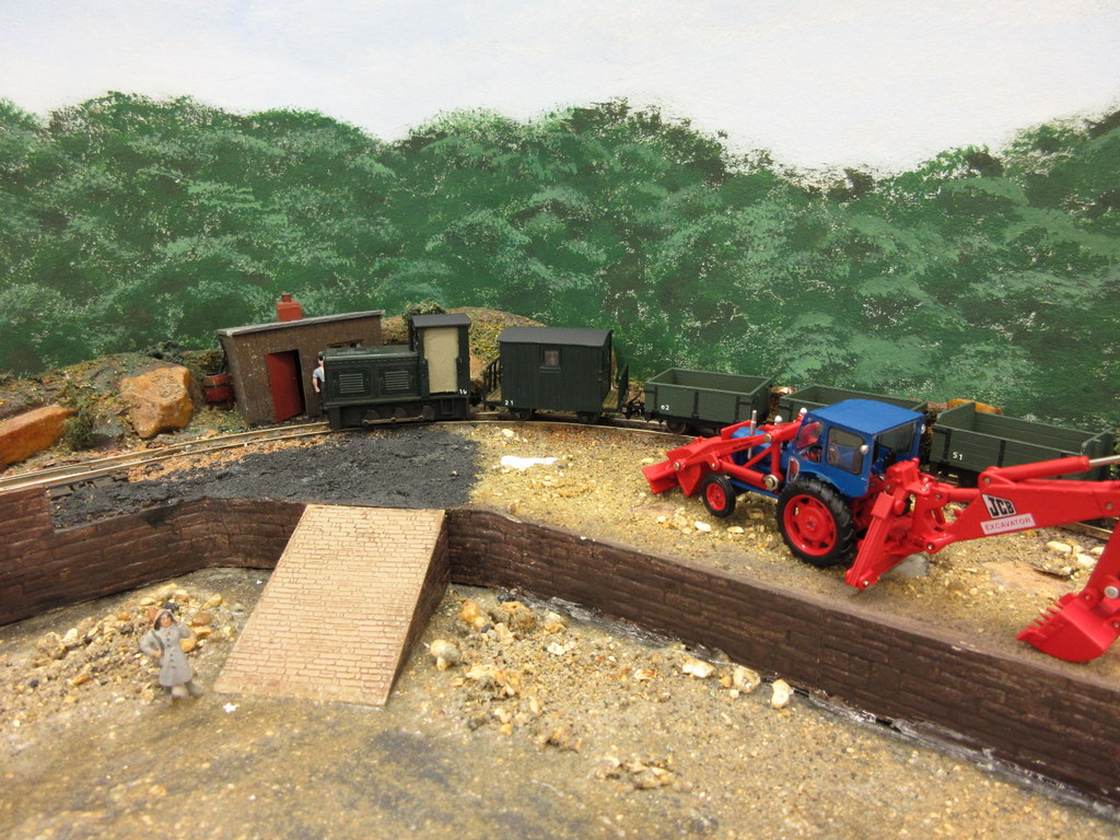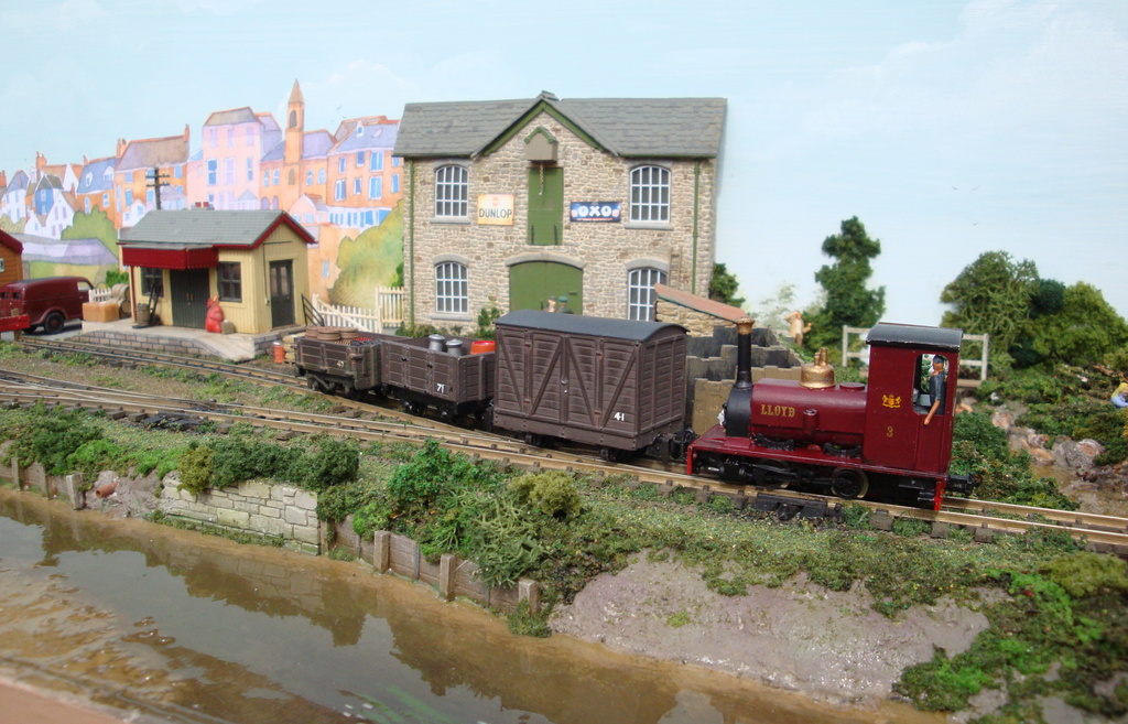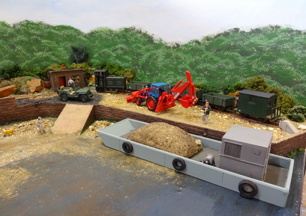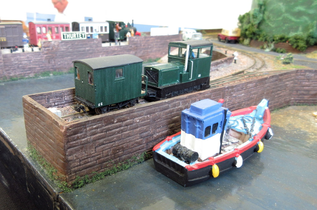 “Thurtey” was originally built in 2005 as a special layout to mark the 30th Anniversary of the Wessex Narrow Gauge Modellers and is quite a unique layout. The track plan is shaped to proclaim the numerals “3” and “0” with the number “3” forming the scenic section of three jetties and a turning triangle, and the “0” as the fiddle yard area. It is 30″ square and designed to be running in 30 seconds of placing it in position. Using second hand items the cost was £30, and there were 30 figures and animals. It was obtained about 2017 and Richard has refreshed much of the scenery, and modified it slightly, making it an operable layout again. Inspired by King Harry Ferry in Cornwall the layout has passengers and vehicles waiting for the ferry to arrive from the other side of the estuary while dredging debris is taken from the estuary bed and loaded into wagons.