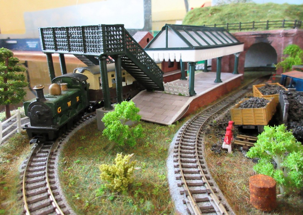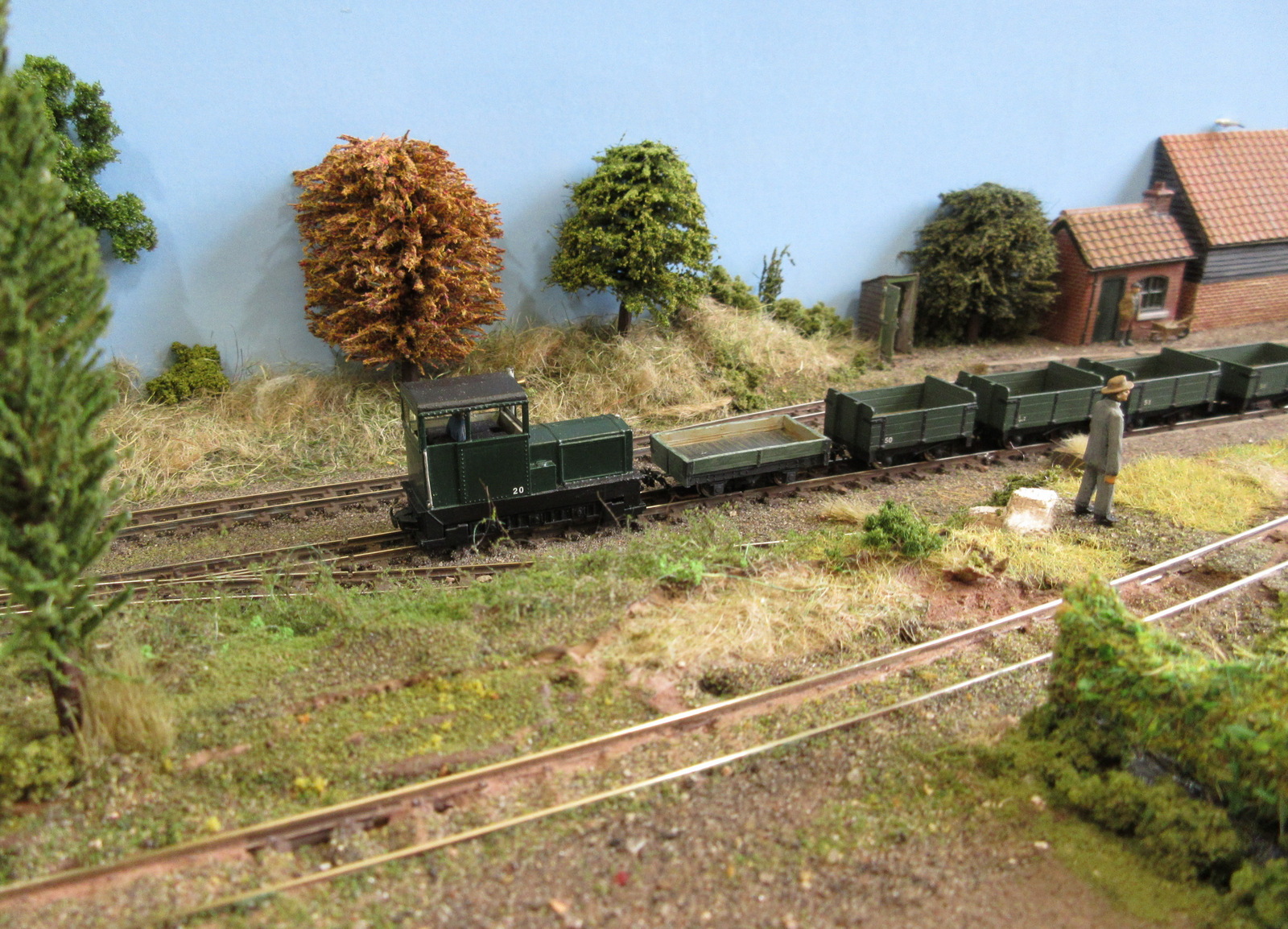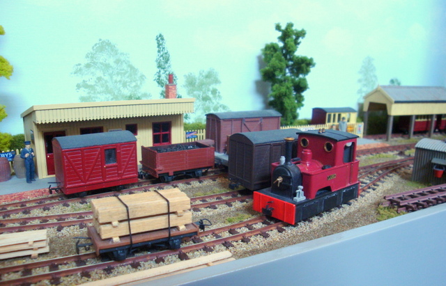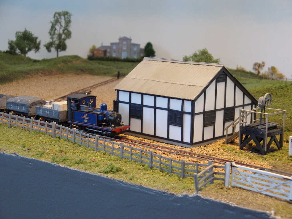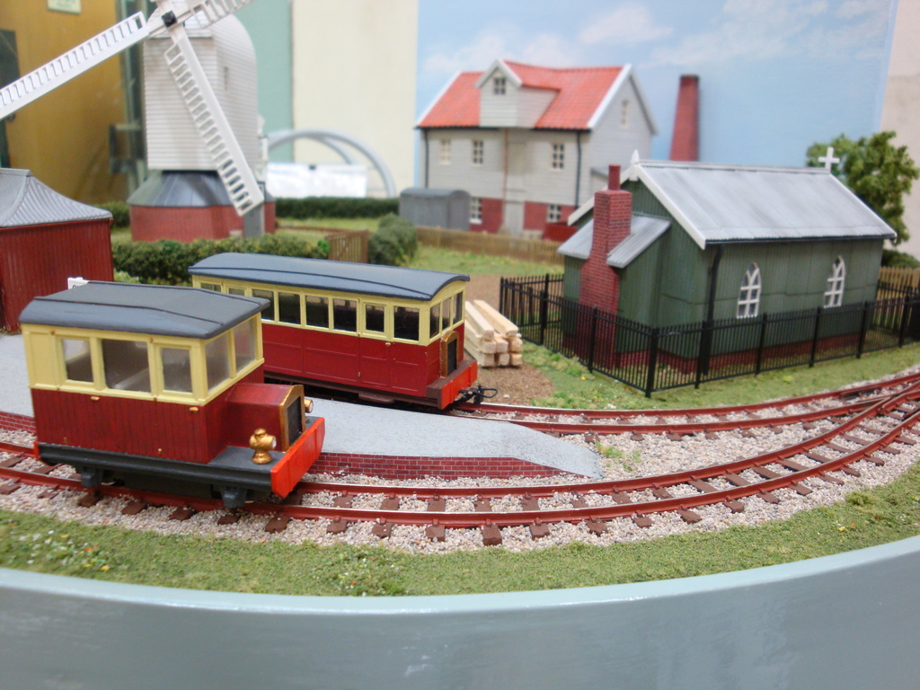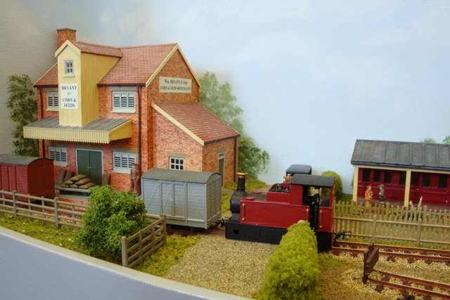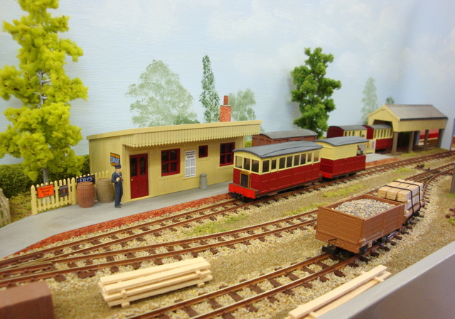 Ashfield Green was built for the Group’s 2015 Challenge, which was to build a narrow gauge layout with a scenic area of just two square foot, the equivalent to 288 sq. inches. The total layout length is 4ft 5″ x 9″ wide. The baseboard was built from MDF and has a simple single track sector plate off-scene. The track layout cleverly contains a passenger terminus, loco facilities, a carriage shed, small goods yard for freight and a siding extending to the local corn and seed merchants. The rural terminus is inspired by the North Suffolk countryside. The corn merchants building is built with card walls covered in Howard Scenics brick paper the roof is Wills plain tiles. The railway cottage is built with a Hornby “Clarabelle” carriage with a Wills sheet and batten roof. The station building is a modified Heljan kit and the engine shed and carriage shed are made with Wills and Evergreen sheets. The locos that are run are tram locomotives mainly white metal kits based on Kato 11-103 “N” gauge chassis, the coaches are Dundas kits and goods stock by Dundas or 009 Society flat wagon chassis with scratch built fittings and loads.