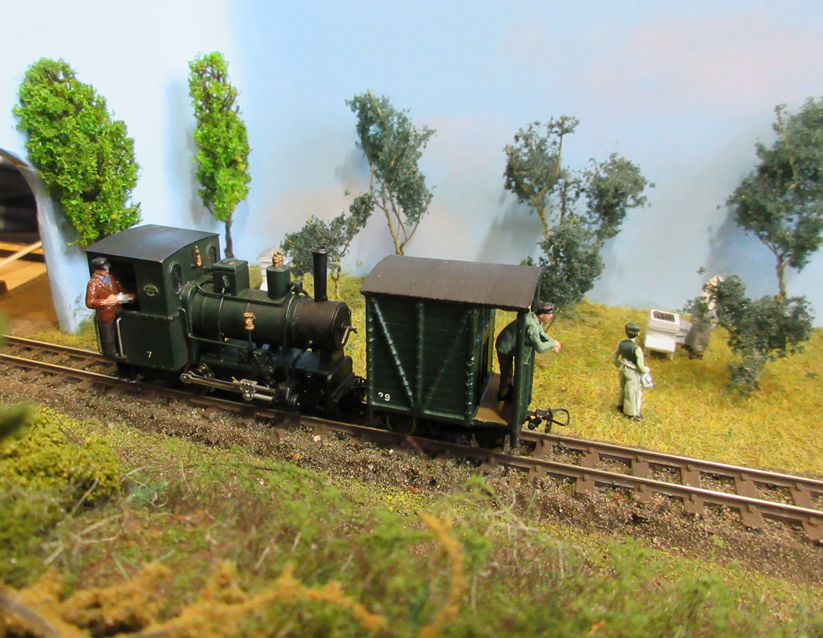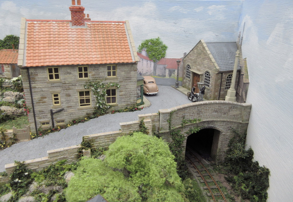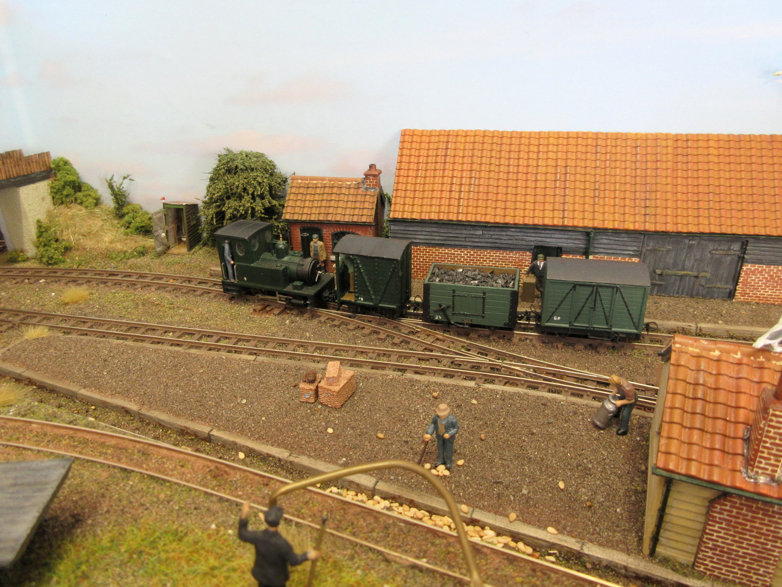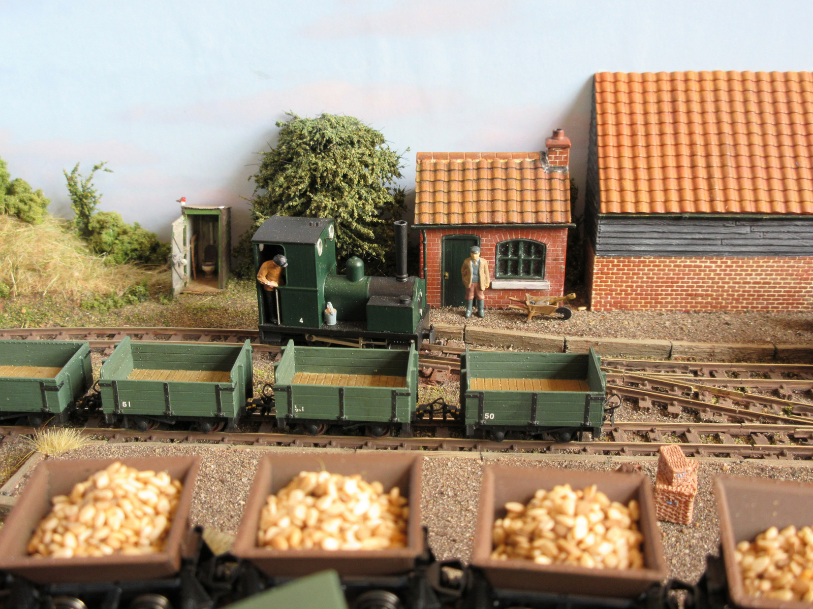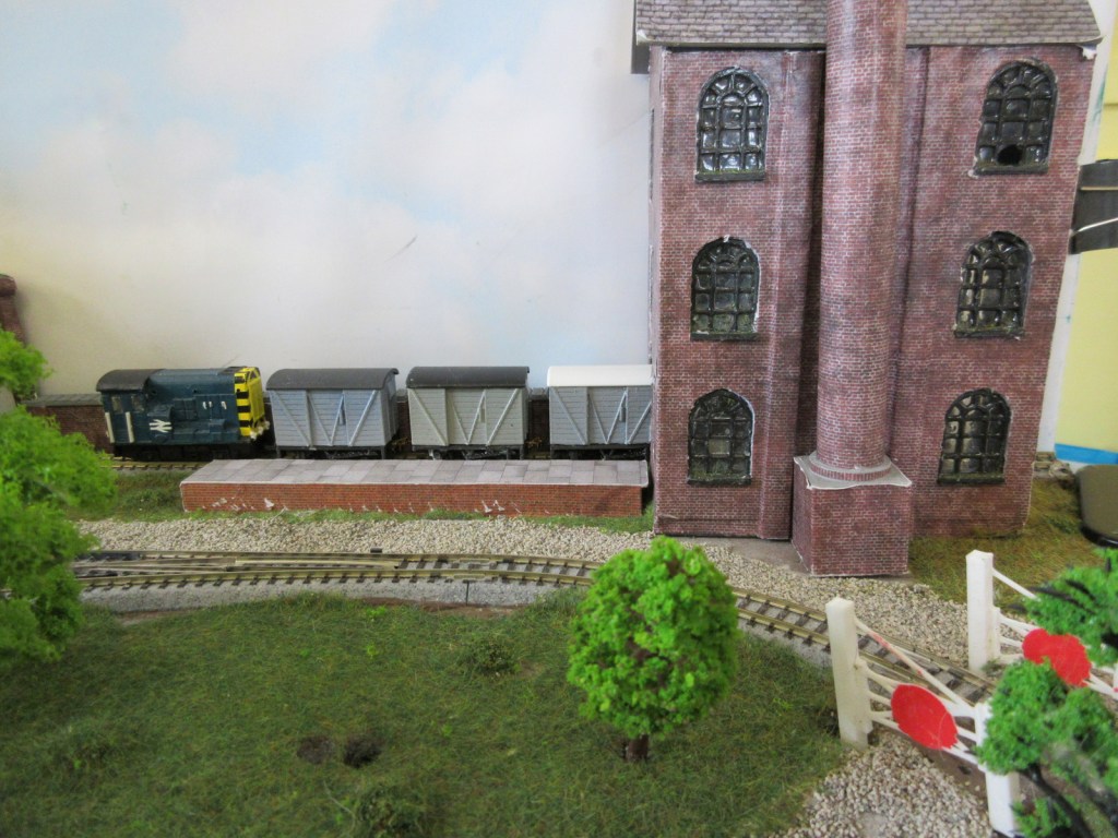 Ashfield Green was built for the Group’s 2015 Challenge, which was to build a narrow gauge layout with a scenic area of just two square foot, the equivalent to 288 sq. inches. The total layout length is 4ft 5″ x 9″ wide. The baseboard was built from MDF and has a simple single track sector plate off-scene. The track layout cleverly contains a passenger terminus, loco facilities, a carriage shed, small goods yard for freight and a siding extending to the local corn and seed merchants. The rural terminus is inspired by the North Suffolk countryside. The corn merchants building is built with card walls covered in Howard Scenics brick paper the roof is Wills plain tiles. The railway cottage is built with a Hornby “Clarabelle” carriage with a Wills sheet and batten roof. The station building is a modified Heljan kit and the engine shed and carriage shed are made with Wills and Evergreen sheets. The locos that are run are tram locomotives mainly white metal kits based on Kato 11-103 “N” gauge chassis, the coaches are Dundas kits and goods stock by Dundas or 009 Society flat wagon chassis with scratch built fittings and loads.