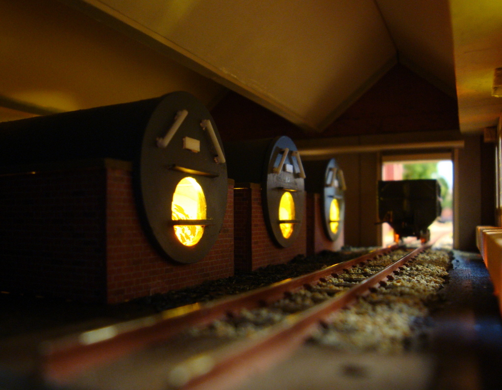 The narrow gauge railway delivers the materials required for the steam pumping engine, water filters, water treatment works and the workshops. The beam engine can be seen working in the pumping engine house along with the coal fires in the boiler house beside it.