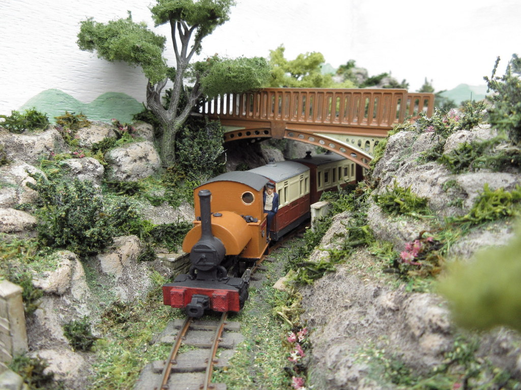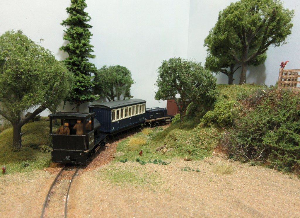 After a spell modelling in Gn15 scale, Graham returned to 009 to build a layout based on a Cyril Freezer plan in the Peco booklet “60 plans for small railways”. It had appealed to him for a long time so when he found a suitable piece of ply wood (44″ x 24″) in his garage, construction began. The plan has been modified to a continuous run and runs from a lower station with goods siding, up “Shortwaite Hill” to an upper station with an engine shed and goods yard. The structures are mainly scratch built from Wills materials sheets, although there are some modified kits too on the layout, they represent North Yorkshire buildings. Locomotives are two Minitrains Bagnall wing tanks, a Narrow Planet Bagnall saddle tank, an old Jouef Decauville, a Peco “James” mounted on a Kato 11-103 as a tram loco, a scratch built diesel tractor and a Corgi die-cast rail bus conversion. Most of the stock is Dundas or Ashby/009 Society 4-wheeled types.
