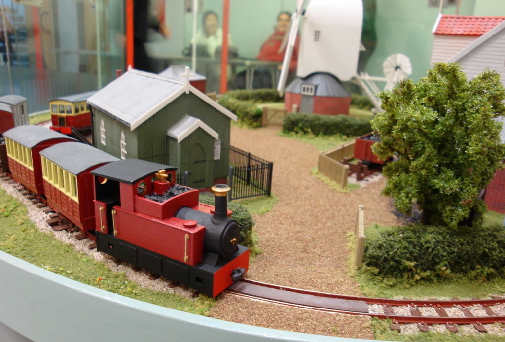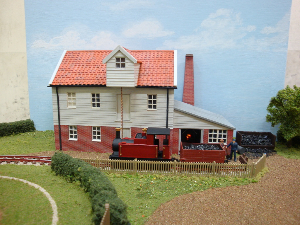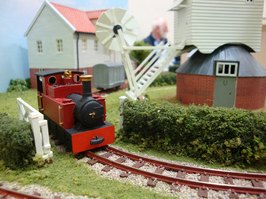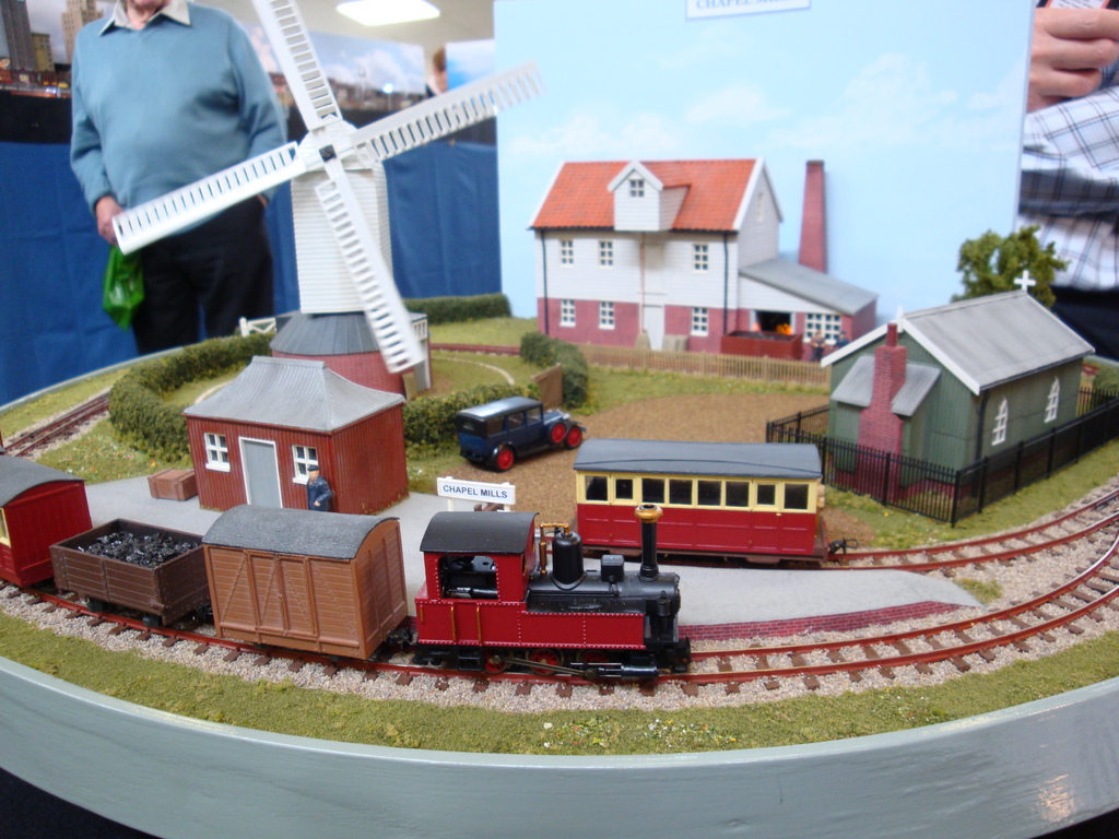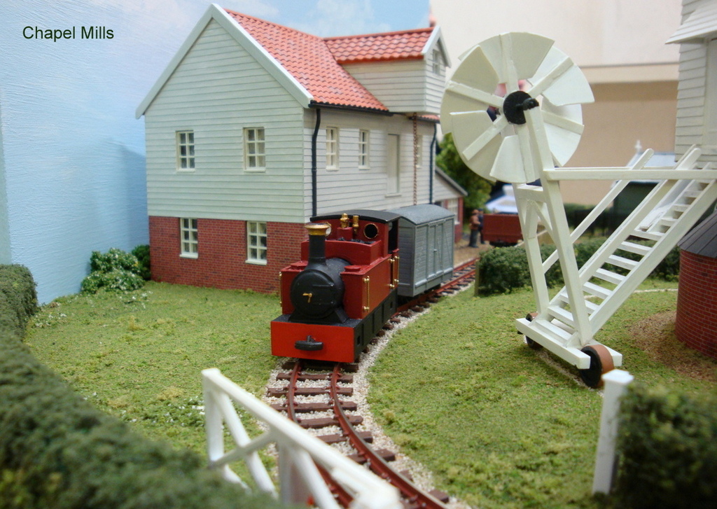 “Chapel Mills” depicts a Suffolk milling site where the traditional post mill is still at work. With the arrival of the narrow gauge railway a new steam mill has been built. The layout was built for a competition to build a narrow gauge “pizza” layout up to 600mm in diameter. There are three animations in the scene: the post mill revolves with the variable “wind speed”, the grain hoist lifts bags of grain in the steam mill, and the steam boiler fire burns. The pictures were taken a few years ago showing some of Chris’s earlier locomotives.