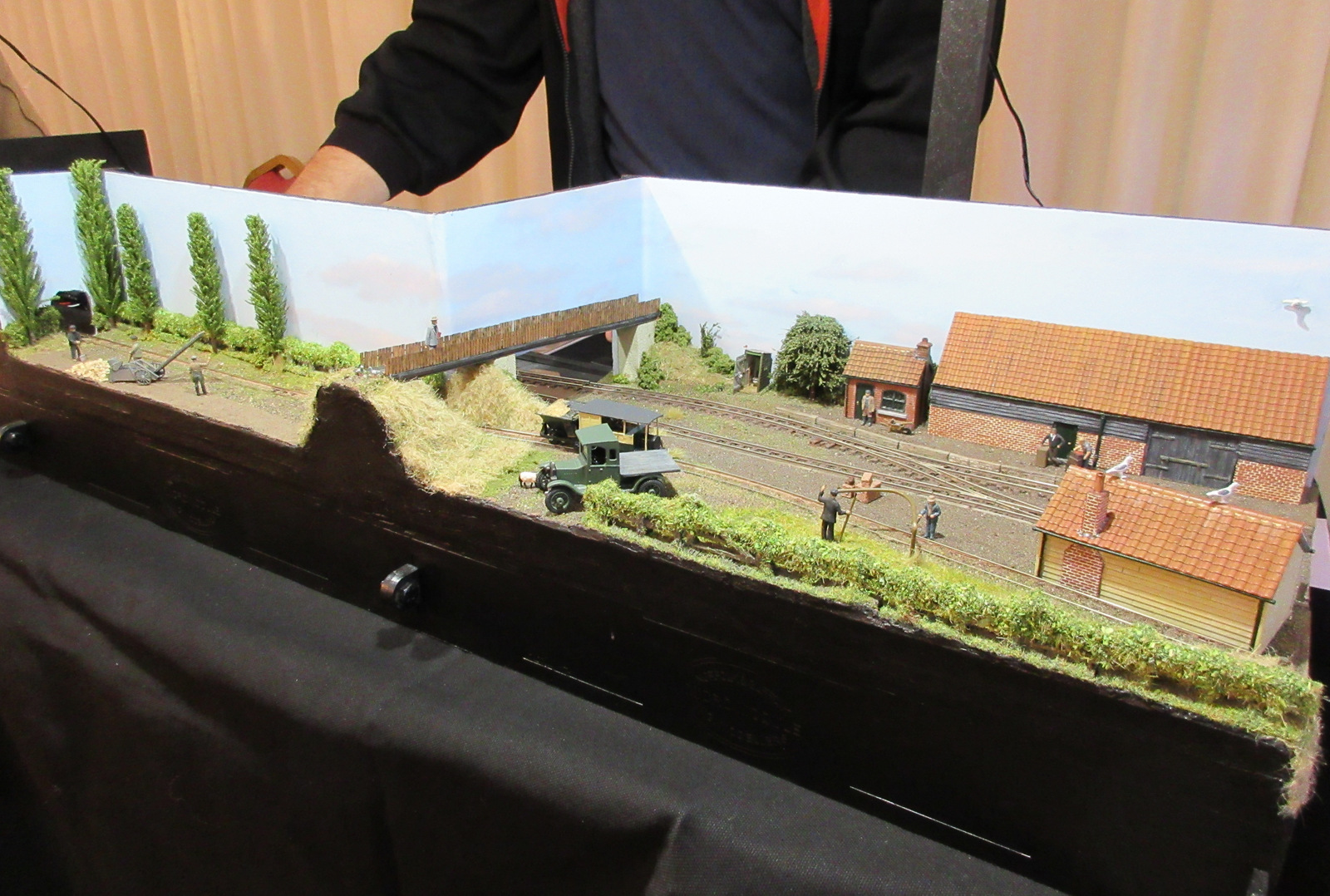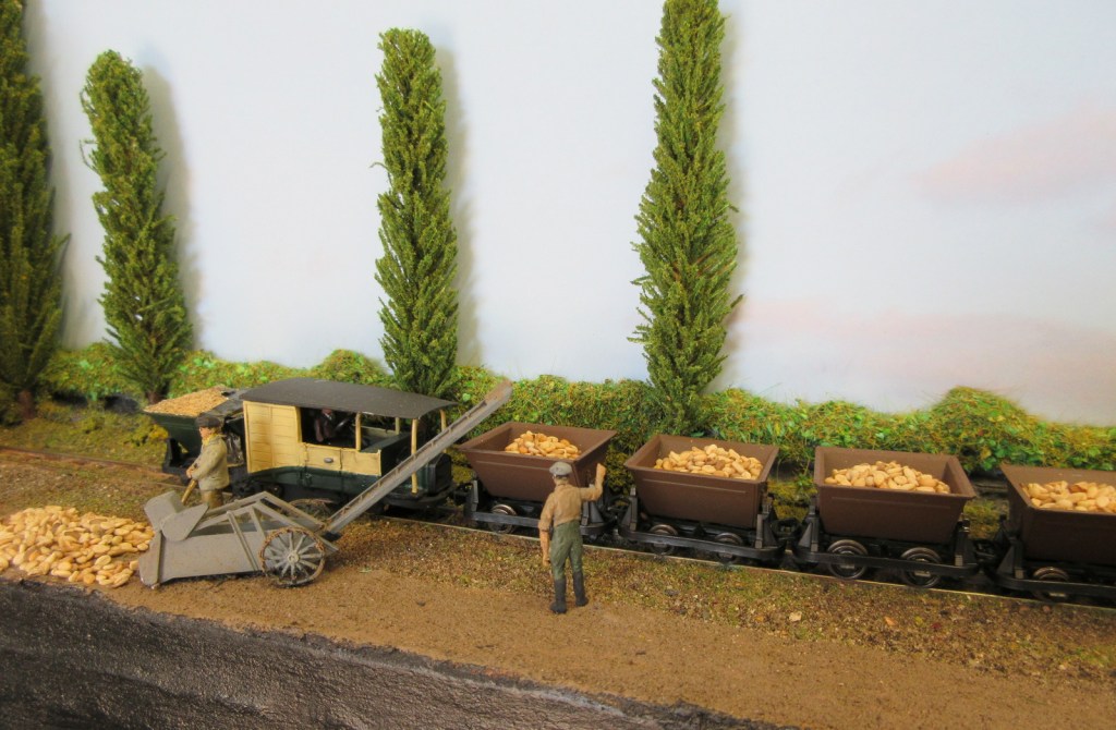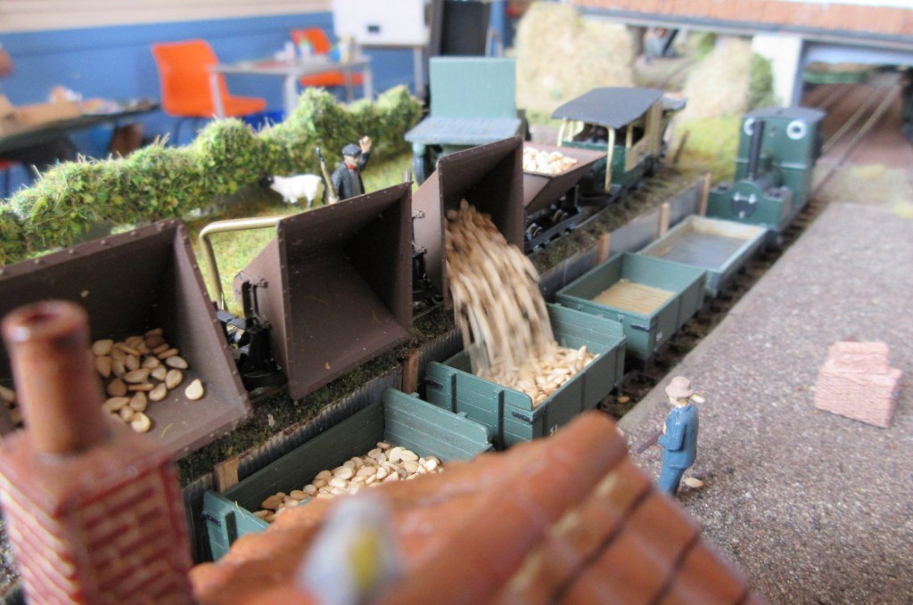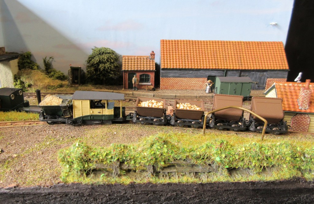 “Staines Barn” was inspired by a Farmer Pykes short-lived sugar beet line in Norfolk running from near to Claxton to the River Yare for loading into a Wherry, and on to Cantley sugar beet factory. On the layout, which is built on two Norfolk Heath Works module boards, the beet is tipped into larger wagons for onward shipment. It also carries general freight and a few passengers. A feature of the line is strange loco built from a 1914 Model T Ford and a skip wagon chassis which has been modelled for the upper line from the fields.
