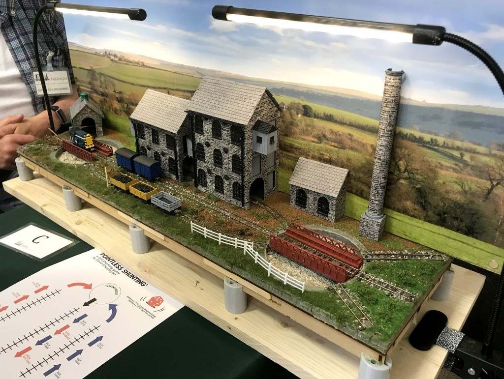 One of “Challenge 2023” entries, a unique, novel layout, “Pointless Shunting” is a freelance layout based on a shunting puzzle/game using two turntables rather than turnouts (hence it’s title). At one end, a train is built-up wagon by wagon using a dice to decide which wagons are collected in which order. Once the train is complete, it is hauled down to the other end. The wagons are then split one by one into the two sidings. Much of the stock, the loco bodies, wagons etc., and the buildings are 3D printed at home. The turntables are run by electronics to stop at the correct tracks.